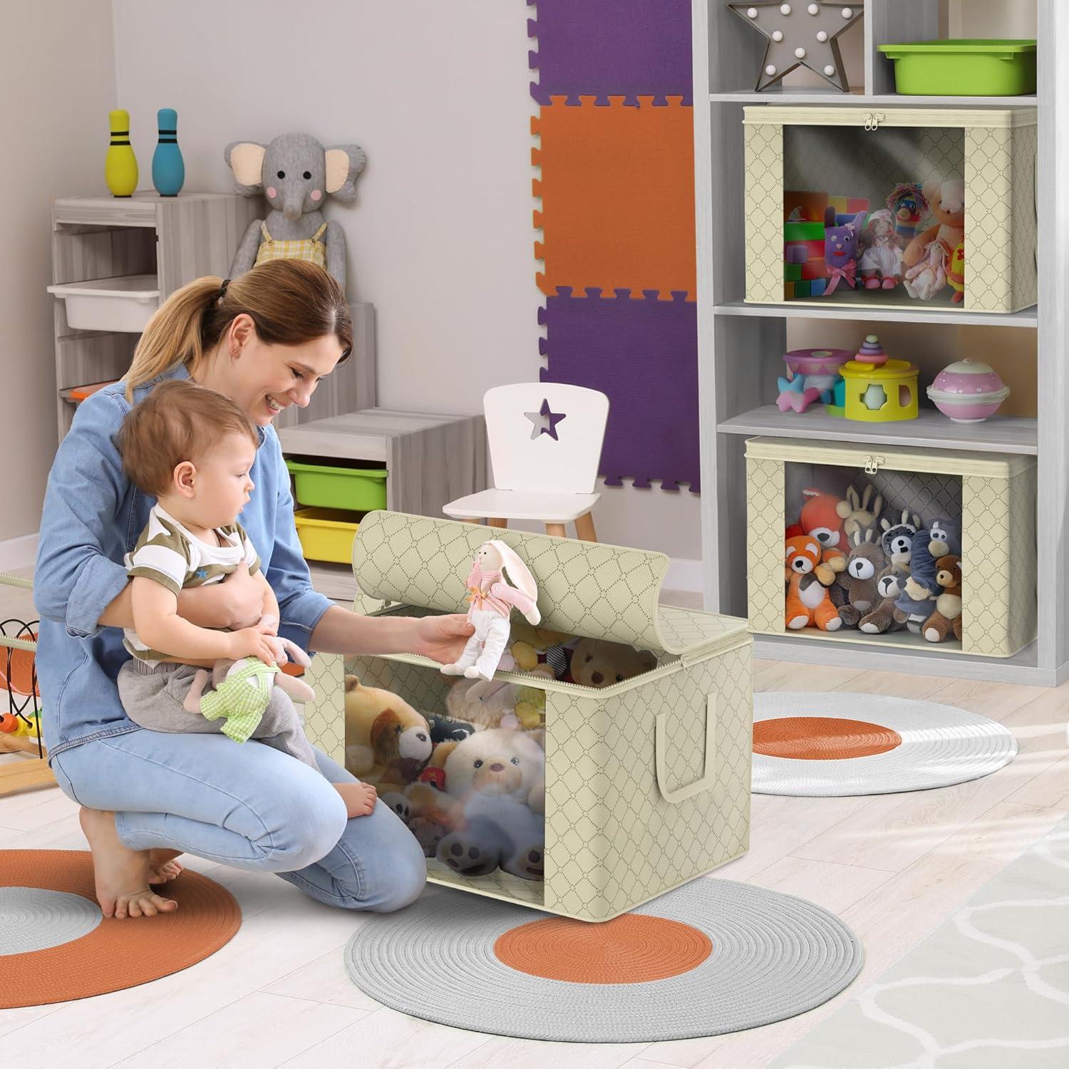 Sorbus Foldable Storage Bag Organizers, Large Clear Window & Carry Handles, Great for Clothes, Blankets, Closets, Bedrooms, and more (4 Pack, Gray)(Beige)
