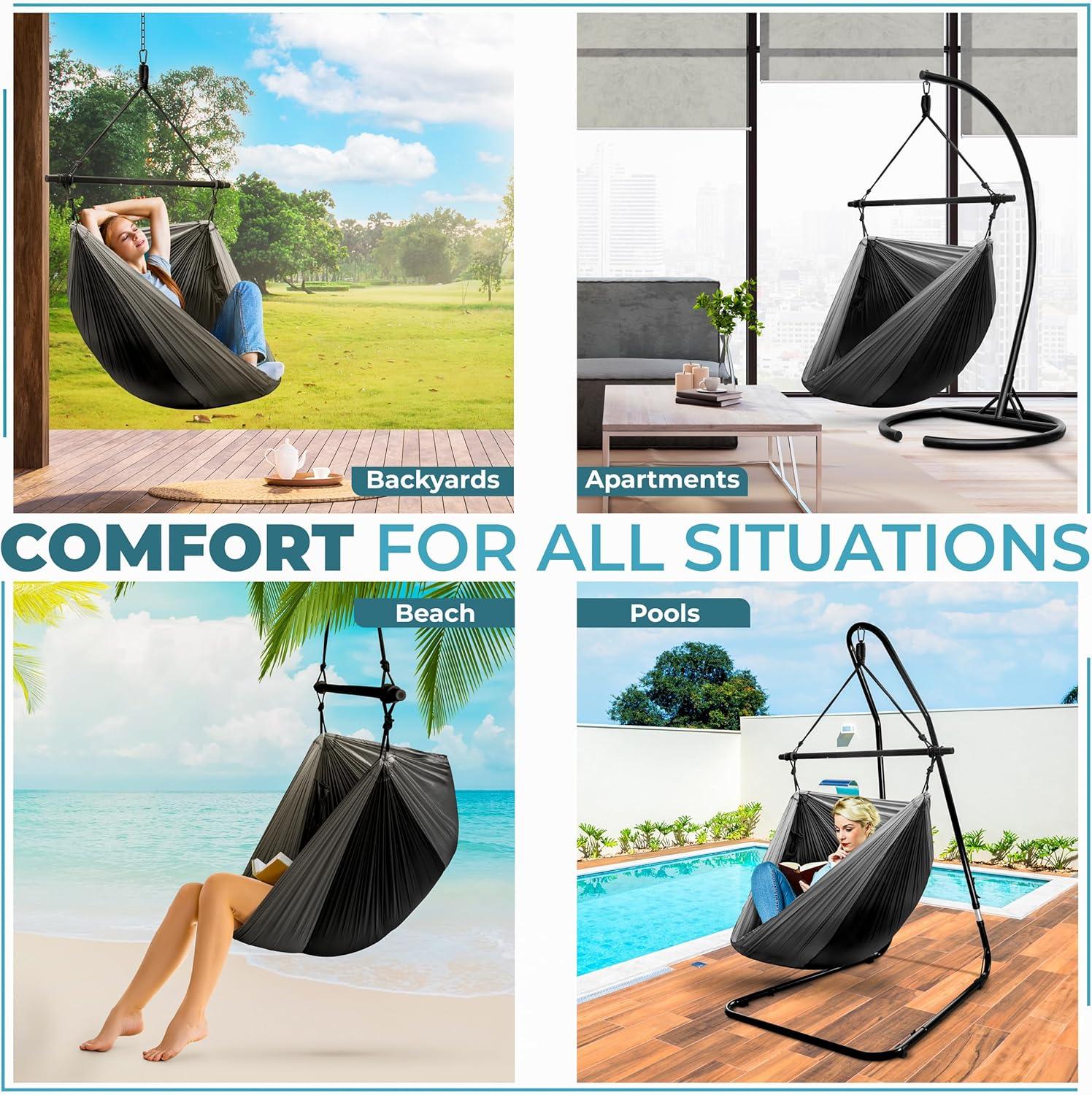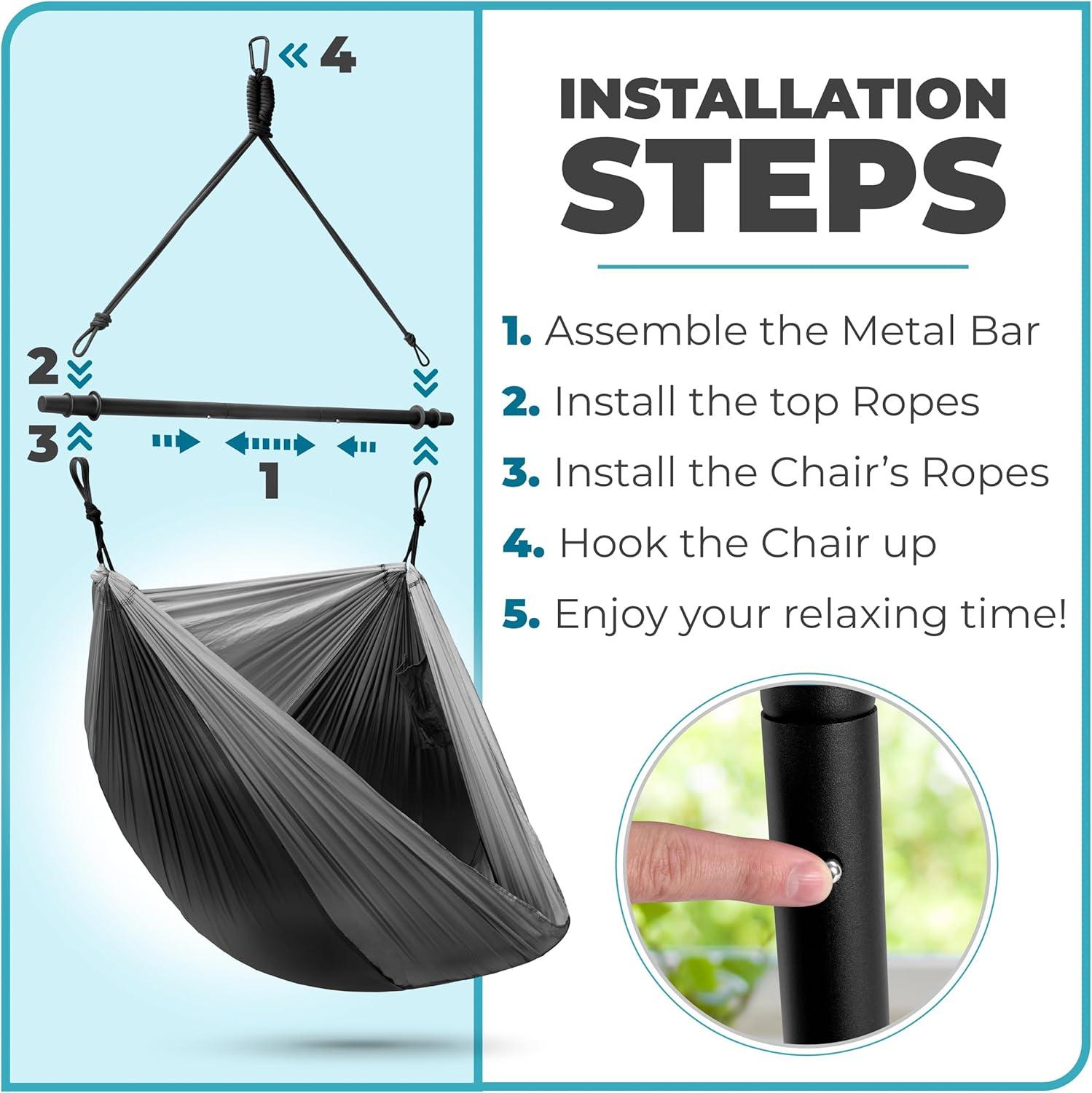Easy Installation: Set up your hammock camping chair hammock in minutes: simply assemble the metal bar, install the support ropes, hook up your chair, and relax! Instructions included.