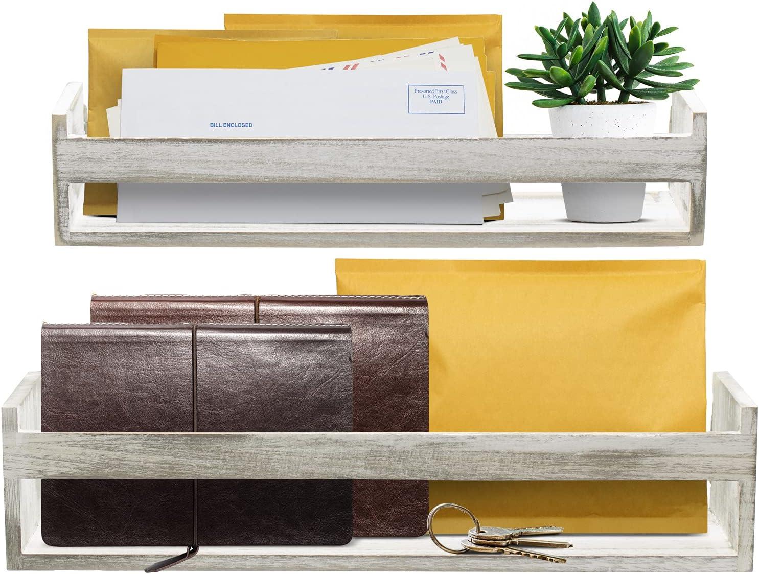 STURDY DESIGN — Very sturdy — Strong enough to hold your favorite small objects — Rustic distressed style shelf (with crossbar for extra security) — Made of 100% Solid Wood — Neutral color — Set of 2 — Approximate Measurements: (LARGE) 15.75” L x 4.25” W x 3.50” H ; (MEDIUM) 13.75” L x 3.50” W x 3” H