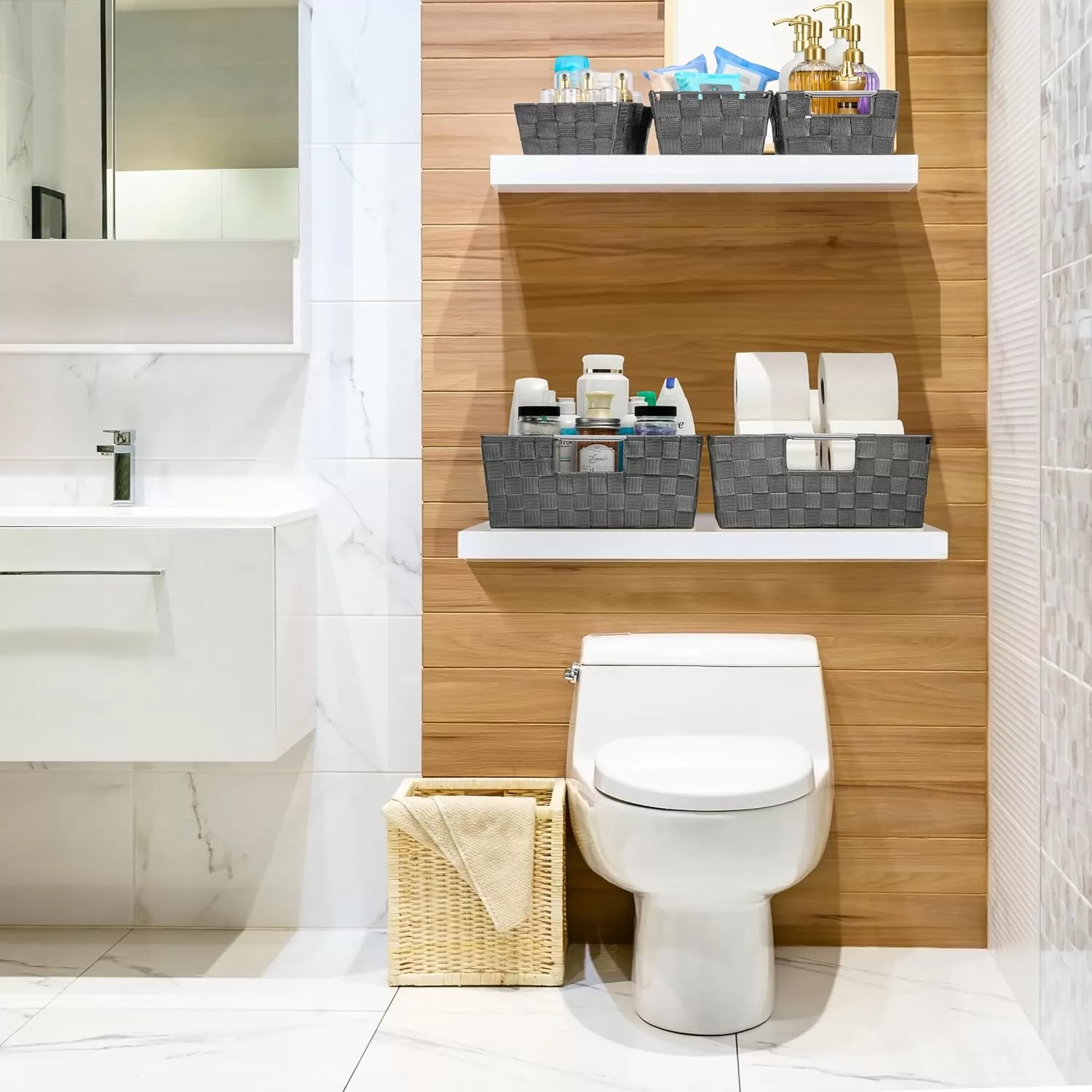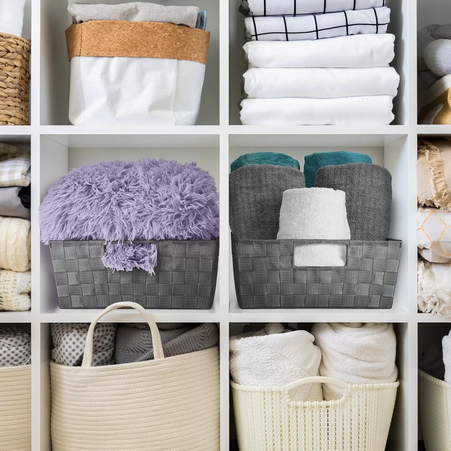 Customizable Storage for Any Room Use the baskets as linen closet organizers, storage bins for shelves, or for decluttering countertops. Multiple sizes make them ideal for towels, toiletries, pantry items, and office supplies.
