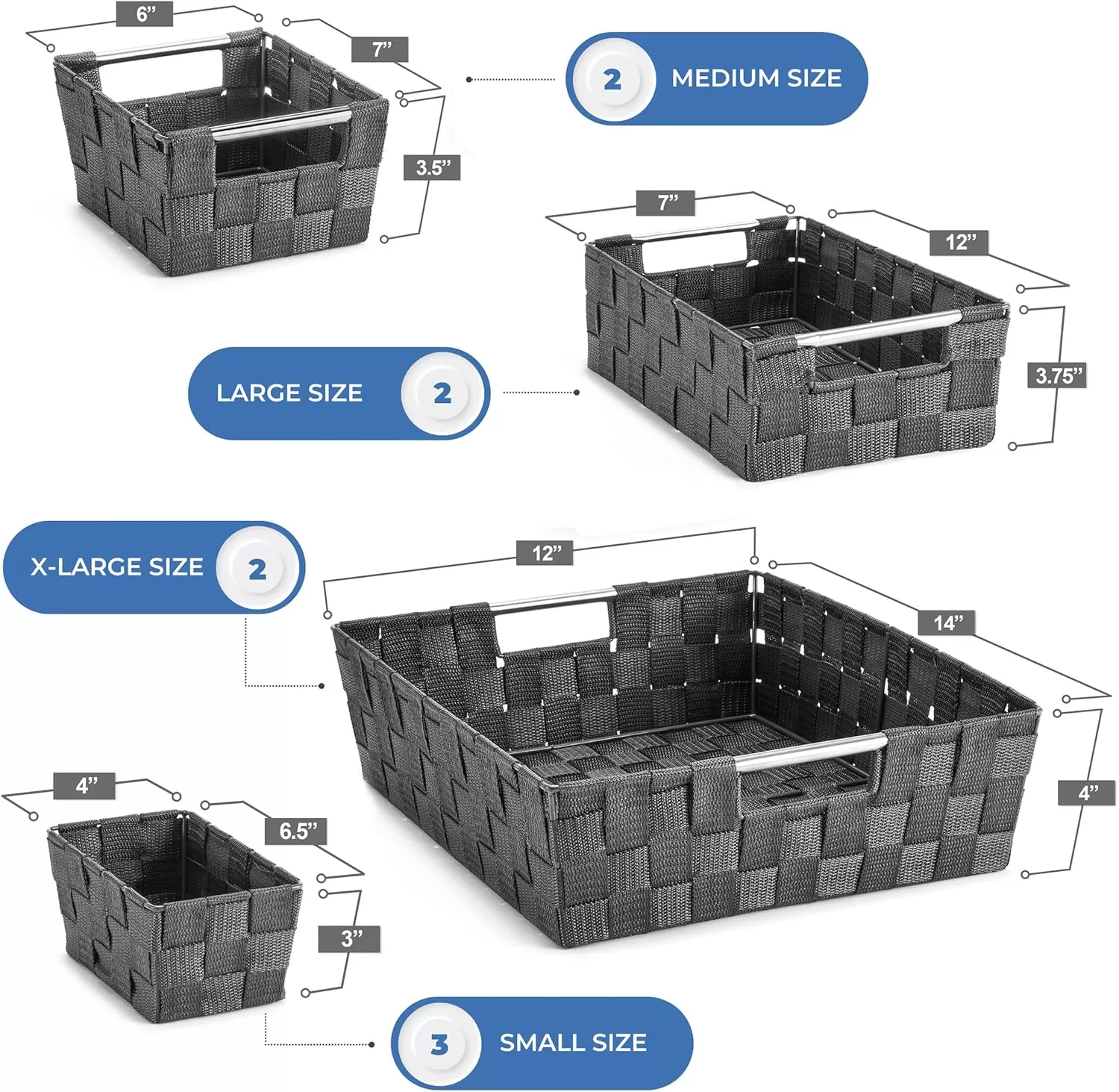 Versatile 9-Piece Set for Complete Organization This set includes 2 Large (14″ x 12″ x 4″), 2 Large Slim (12″ x 7″ x 3.75″), 2 Medium (7″ x 6″ x 3.5″), and 3 Small (6.5″ x 4″ x 3″) baskets, perfect for organizing a variety of items