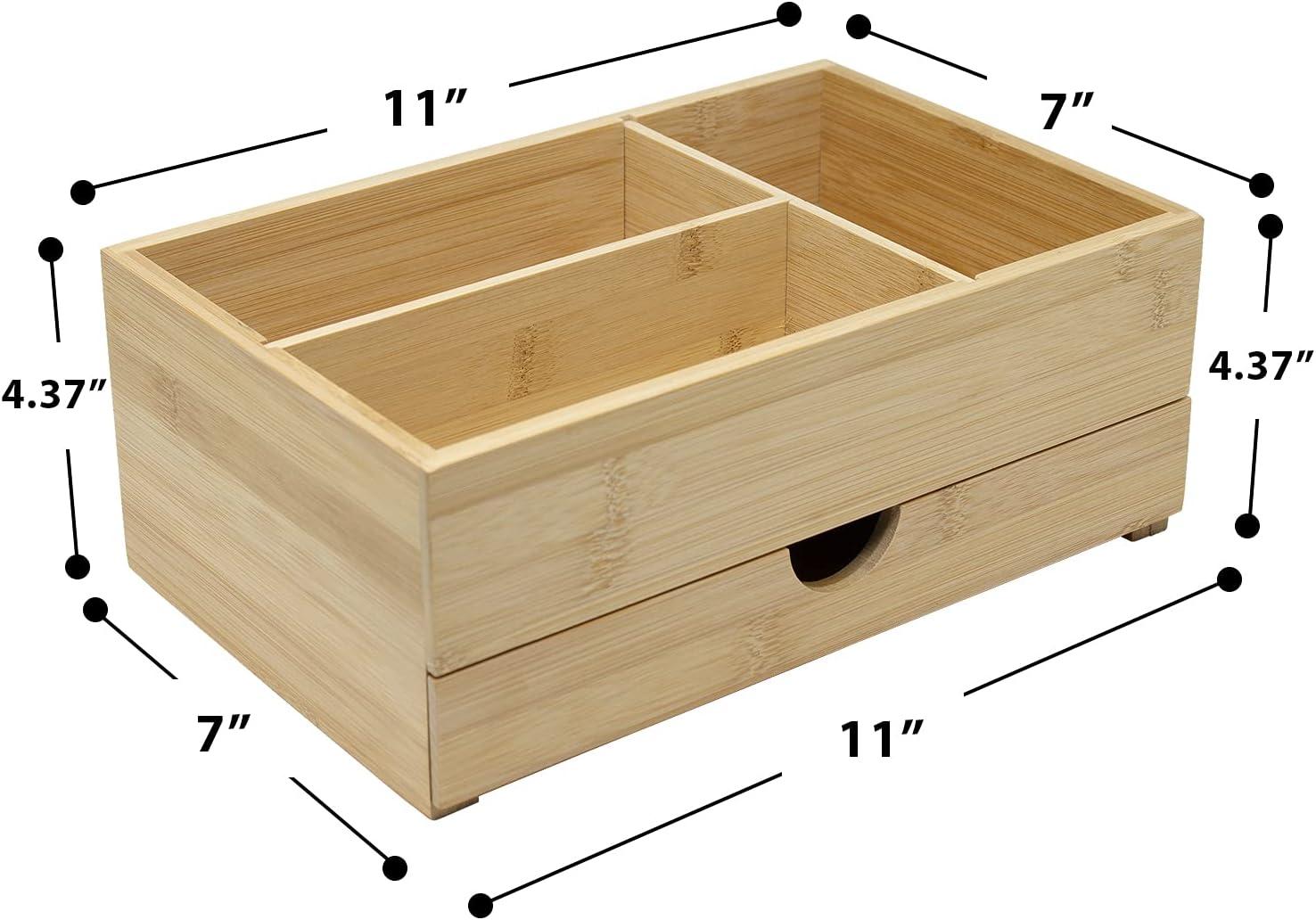 SLEEK DESIGN — Made of 100% solid bamboo wood — Color is natural — Has 3 divided sections and base drawer with scoop handle — No assembly required — Wipe clean — Entire Unit Measures approximately 11” L x 7” W x 4.37” H