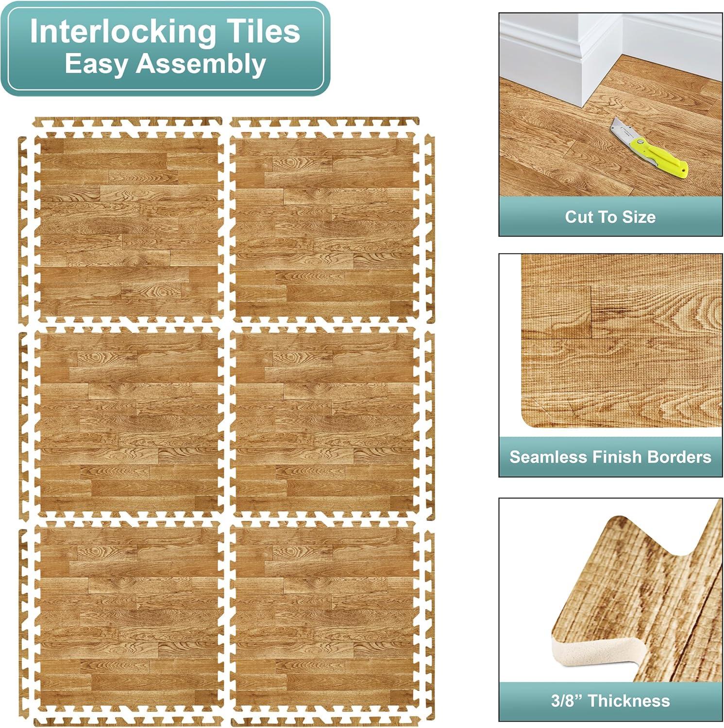 For Home & Business: Fits any room décor that complement a mats wood or foam tiles wood style pattern — Ideal foam tiles for floor and multi-purpose floor mat for living room, basement, playroom, infant crawling area, interlocking exercise floor mats, yoga/meditation room, dorm, laundry room, beneath camping tents and sleeping bags — Makes a great anti fatigue mat for trade shows, conventions, office environment, gym, health care facility, daycare, classroom, and more